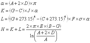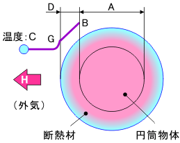 外径A[m]、温度B[℃]の円筒物体が、厚さD[m]、熱伝導率E[W/mK]の断熱材で保温されているとき、 温度C[℃]の大気への放熱は、円筒長さ1m当りH[W/m]です。