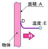 表面積A[m2]、温度B[℃]の平板が、厚さD[m]、熱伝導率E[W/mK]の断熱材で保温されているとき、 温度C[℃]の大気への放熱は、H[W]です。