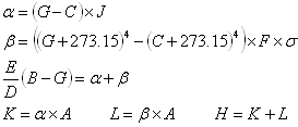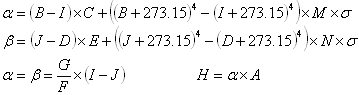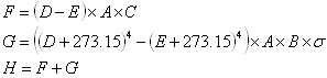 表面積A[m2]、温度D[℃]で、表面の放射率Bの物体が、E[℃]の雰囲気中に置かれているとき、対流による熱損失はF[W]、放射による熱損失はG[W]です。