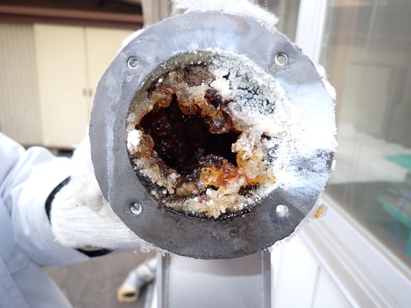 などで温度が下がると結露し、壁や配管に固体や液体として付着します。付着物はねばねばしているので、更に粉じんなどを固着させ、積み重ねるとかなりの堆積物となって配管経路をふさいでいきます。