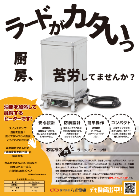 ラードの加熱など、食品の溶解用途に最適。